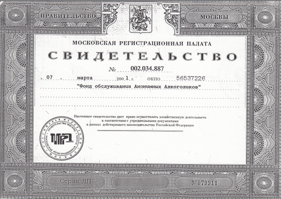 Свидетельство о регистрации фонда обслуживания АА